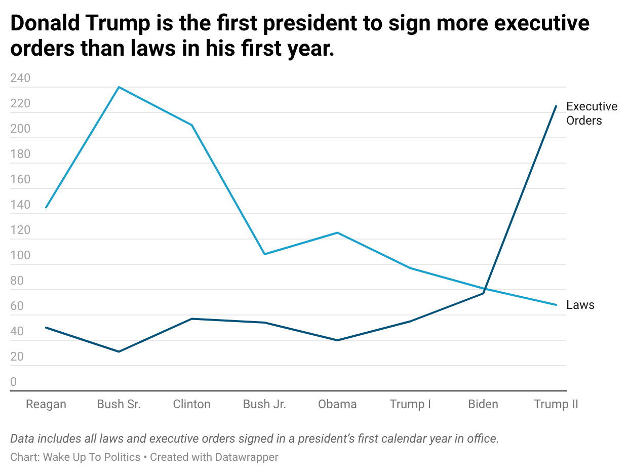 This is a measurably different approach than previous presidents, all of whom have prioritized the legislative process over the issuance of executive orders. And it is one that Trump has openly declared. Just yesterday, Trump was asked if he plans to push for another party-line legislative package, just as he tried to pass two such packages before losing the House in the 2018 midterms, just as Joe Biden passed two such packages before his majority went up in smoke in 2022.