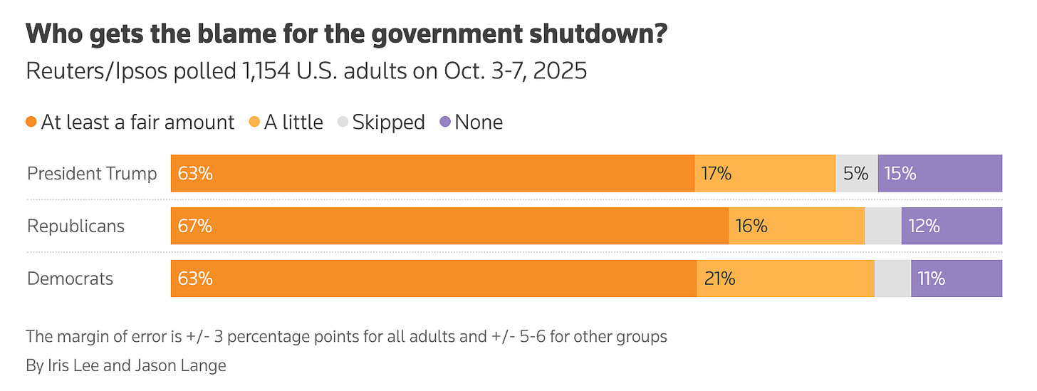Why is this going wrong for Republicans? What did I and other commentators mis?? Below the fold, in my weekly column for paid subscribers, I’ll unpack my thoughts on the shutdown as it approaches the two-week mark — and explain how I think I may have cracked the code that explains how voters decide who to blame for shutdowns.
