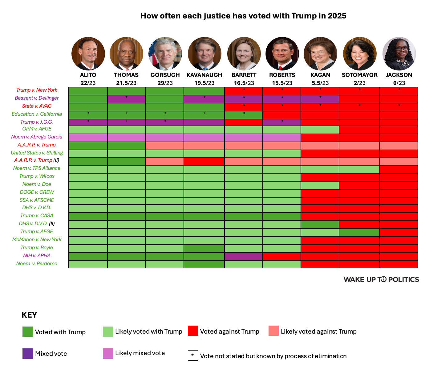 Monday’s ruling in Noem v. Perdomo is the 23rd Trump-related case to come before the full Supreme Court in 2025.1 By my count, Trump has won 15 of them and lost four of them, while four have featured “mixed” rulings that contained both wins and losses for him. (Note that these cases have mostly involved emergency applications to decide the posture of a case while it’s being litigated, so most “wins” or “losses” are only temporary. Not also that when Trump loses in the lower courts, he gets to decide whether or not to mount an emergency appeal with the Supreme Court, so this pool of 23 cases mostly reflects the disputes he chose to bring before the justices.)