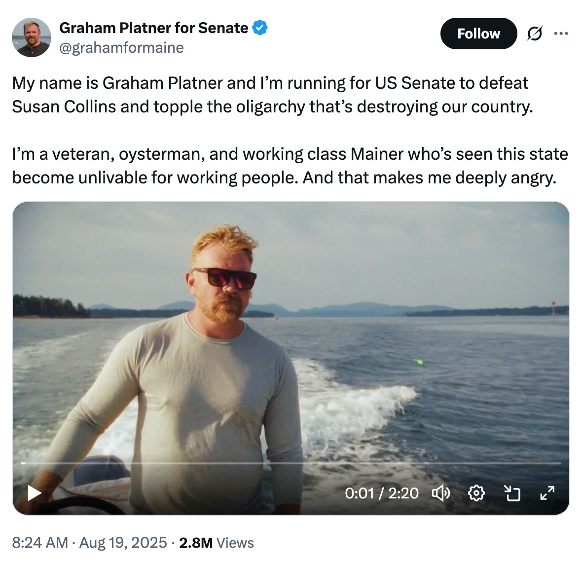 Nevertheless, Democrats celebrated the arrival Tuesday of a new candidate in the race against Collins: Graham Platner, an oyster farmer who served four combat tours in Iraq and Afghanistan.