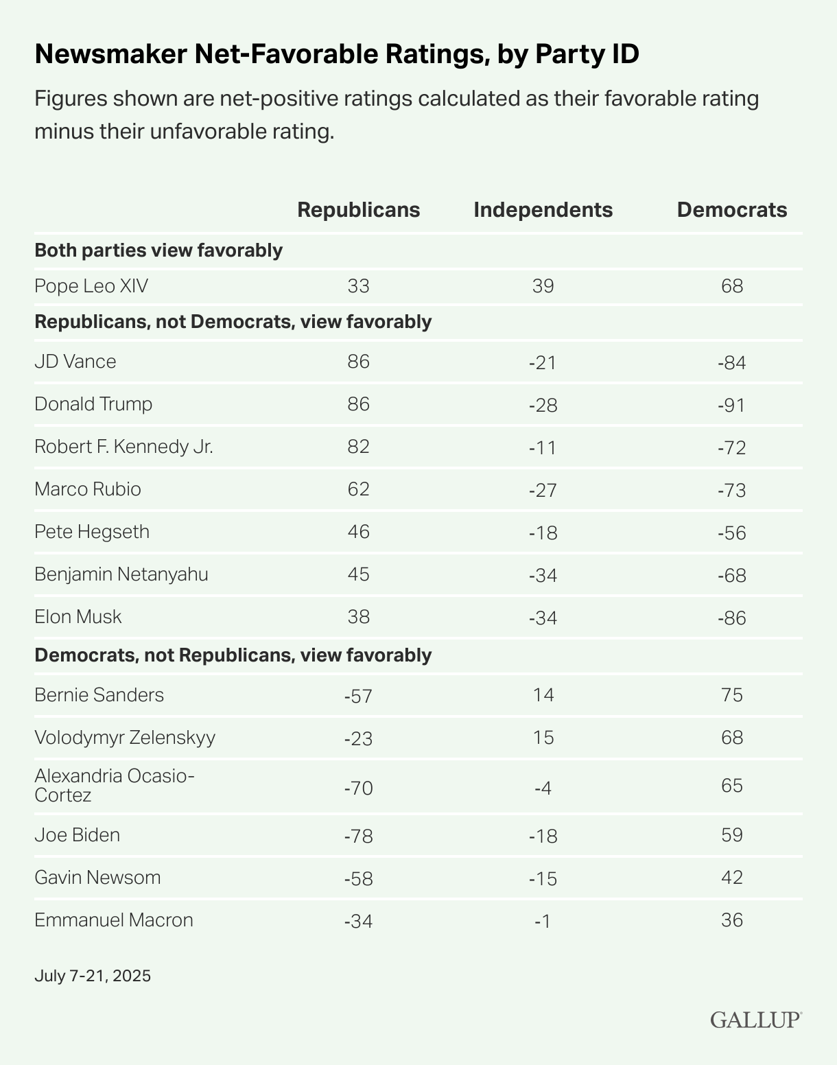 Pope Leo was the only figure above water with members of both parties, although his net favorability was twice as large among Democrats as Republicans.