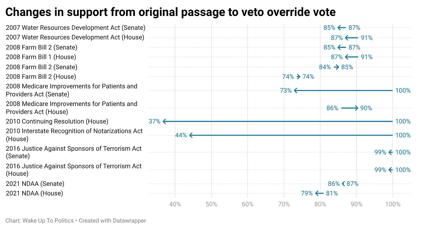Republicans have good reason to worry that their members will break with Trump here. In this century, almost every time a veto-proof bill was vetoed and then an override vote was held, support for the bill barely budged between the original vote and the override vote: