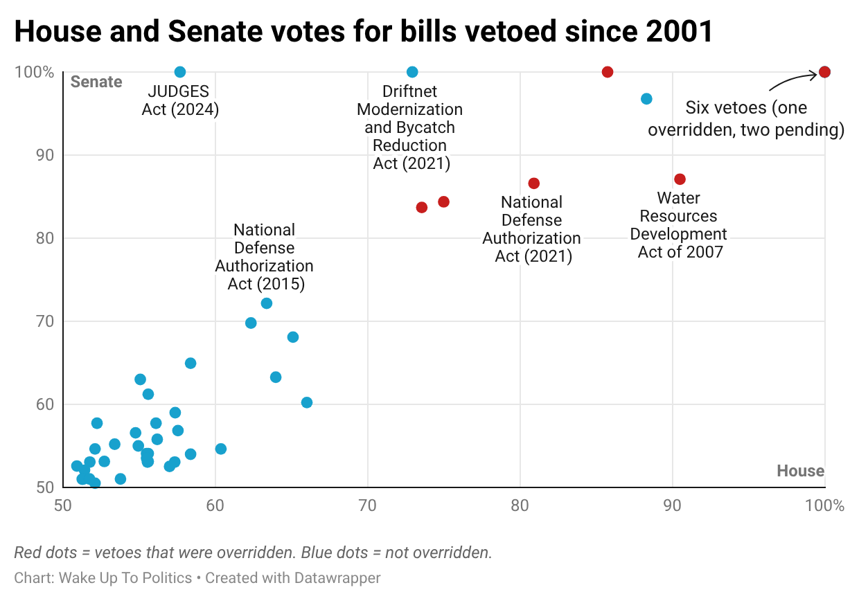 As you can see, most of the 48 bills in the chart land below the 60/60 range: they were supported by less than 60% of representatives and senators before being vetoed.