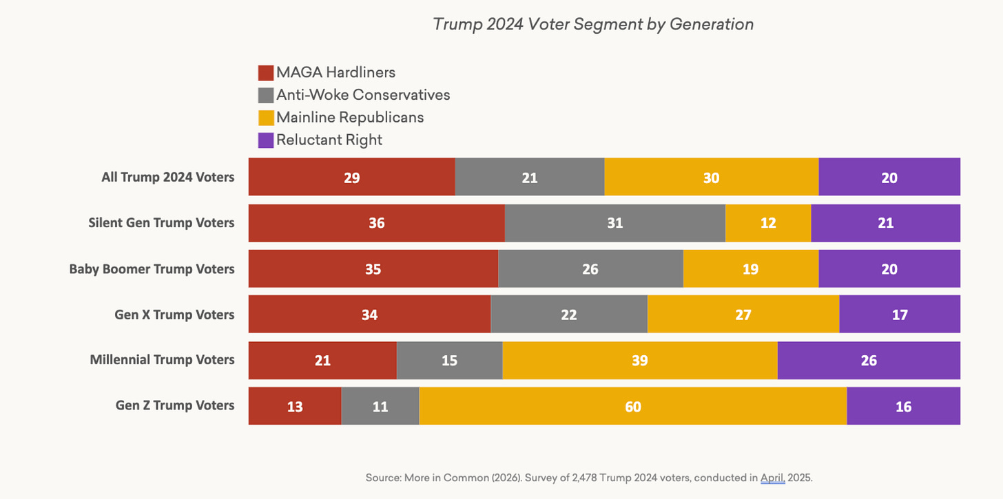 The Gen Z numbers cut against stereotype as well. Contrary to the image in some circles of Gen Z Trump supporters as hard-right conservatives, they are actually the group least likely to code as MAGA Hardliners.