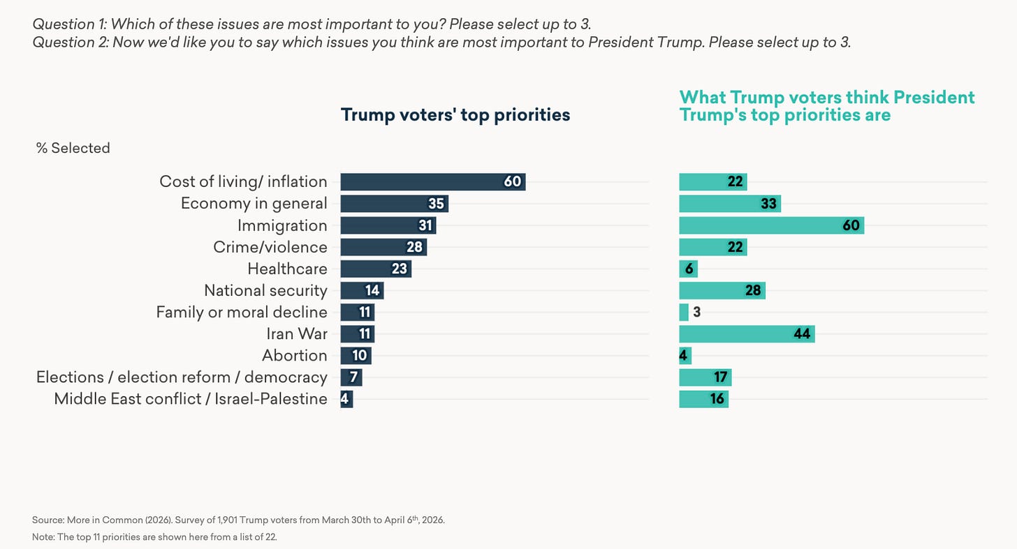 Even more damning: 44% of Trump voters think the Iran war is a top priority for Trump. Only 11% say it is a top priority of theirs.