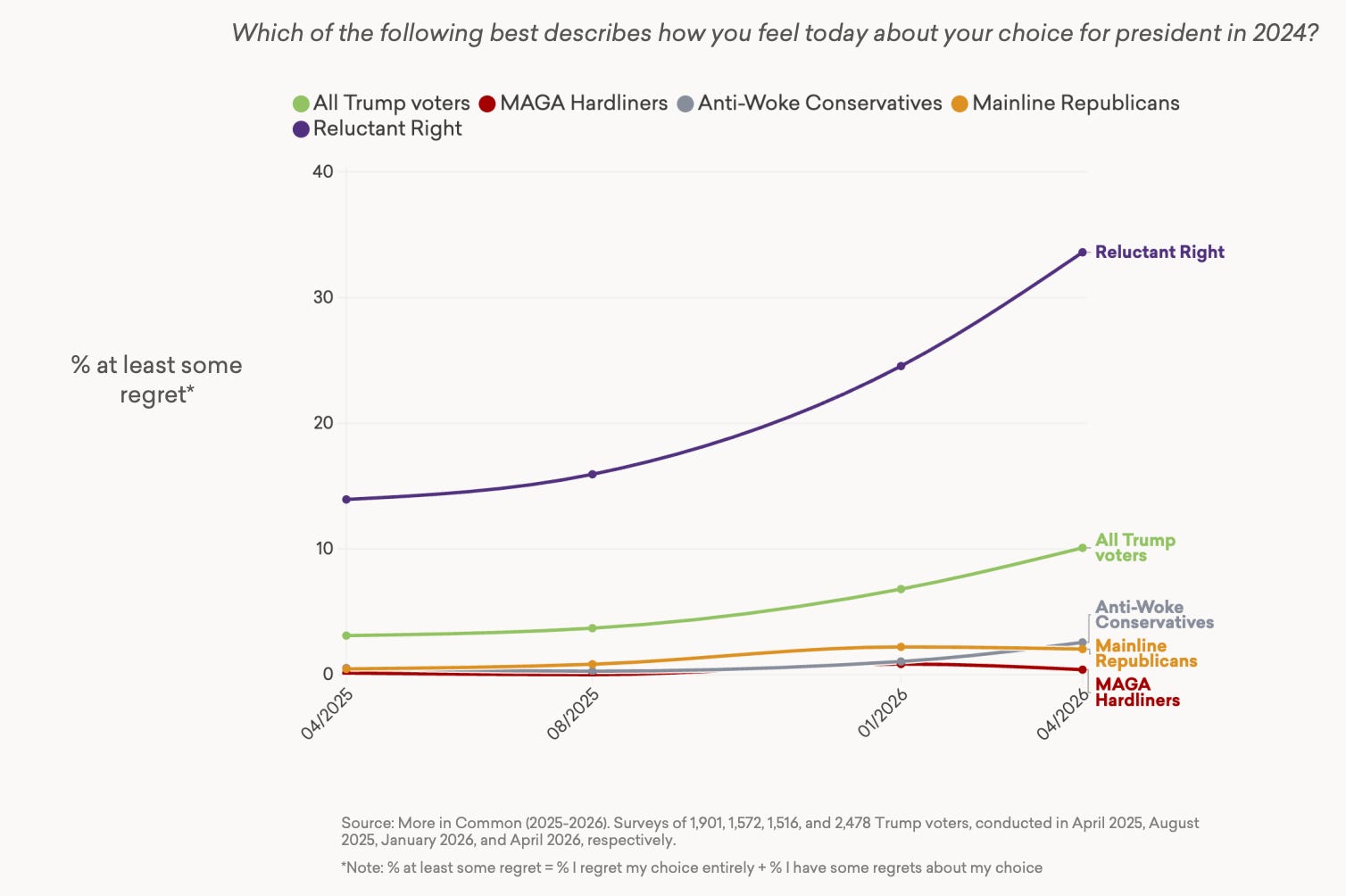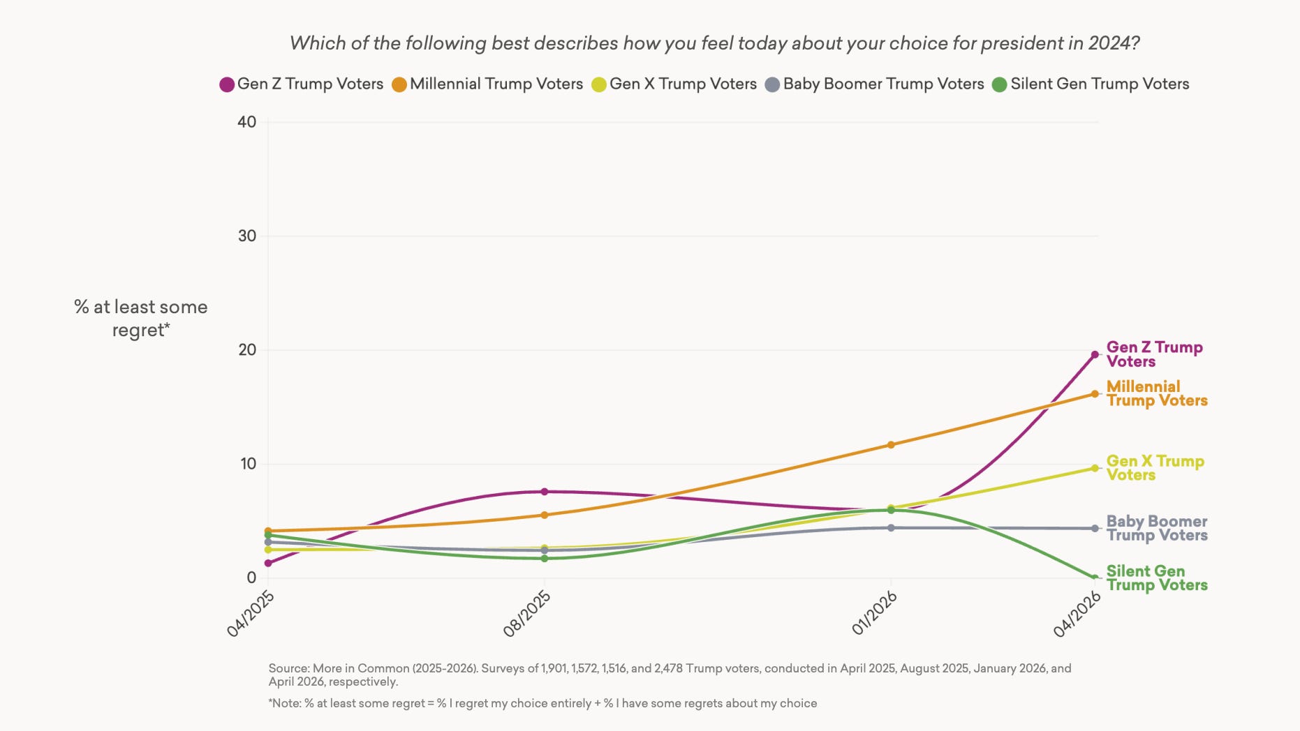 More in Common found a similar trend among Gen Z Trump voters, 20% of whom say they regret their vote, a markedly higher level of second-guessing than expressed by older generations.