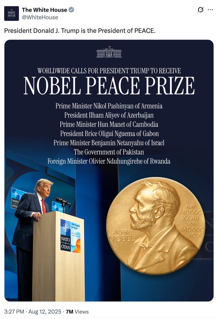 Trump will travel to Alaska tomorrow to meet with Russian President Vladimir Putin in hopes of striking one more, undeniably-Nobel-worthy peace deal: an end to the war in Ukraine.