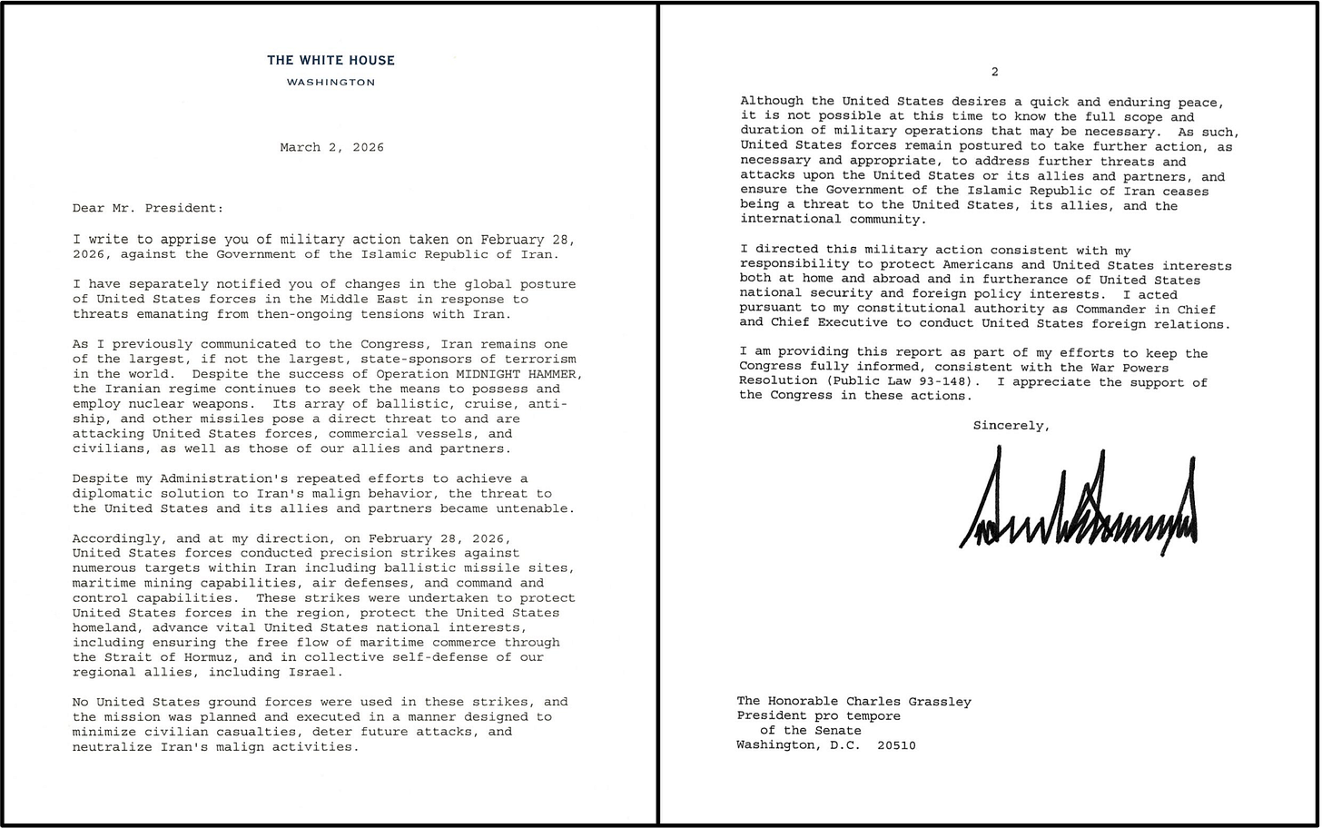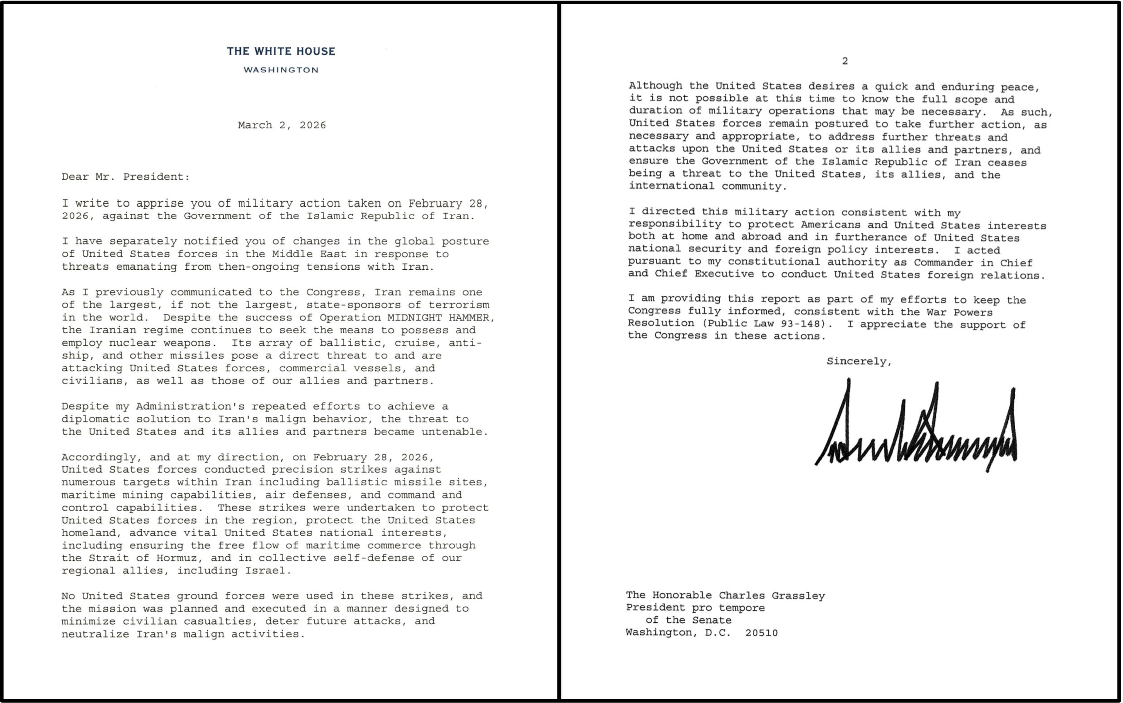 The War Powers Resolution, which became law in 1973 over President Richard Nixon’s veto, says that whenever the U.S. military is “introduced into hostilities” without congressional authorization, the president must report it to Congress within 48 hours. President Trump did that for the Iran war on March 2; his letter is below.