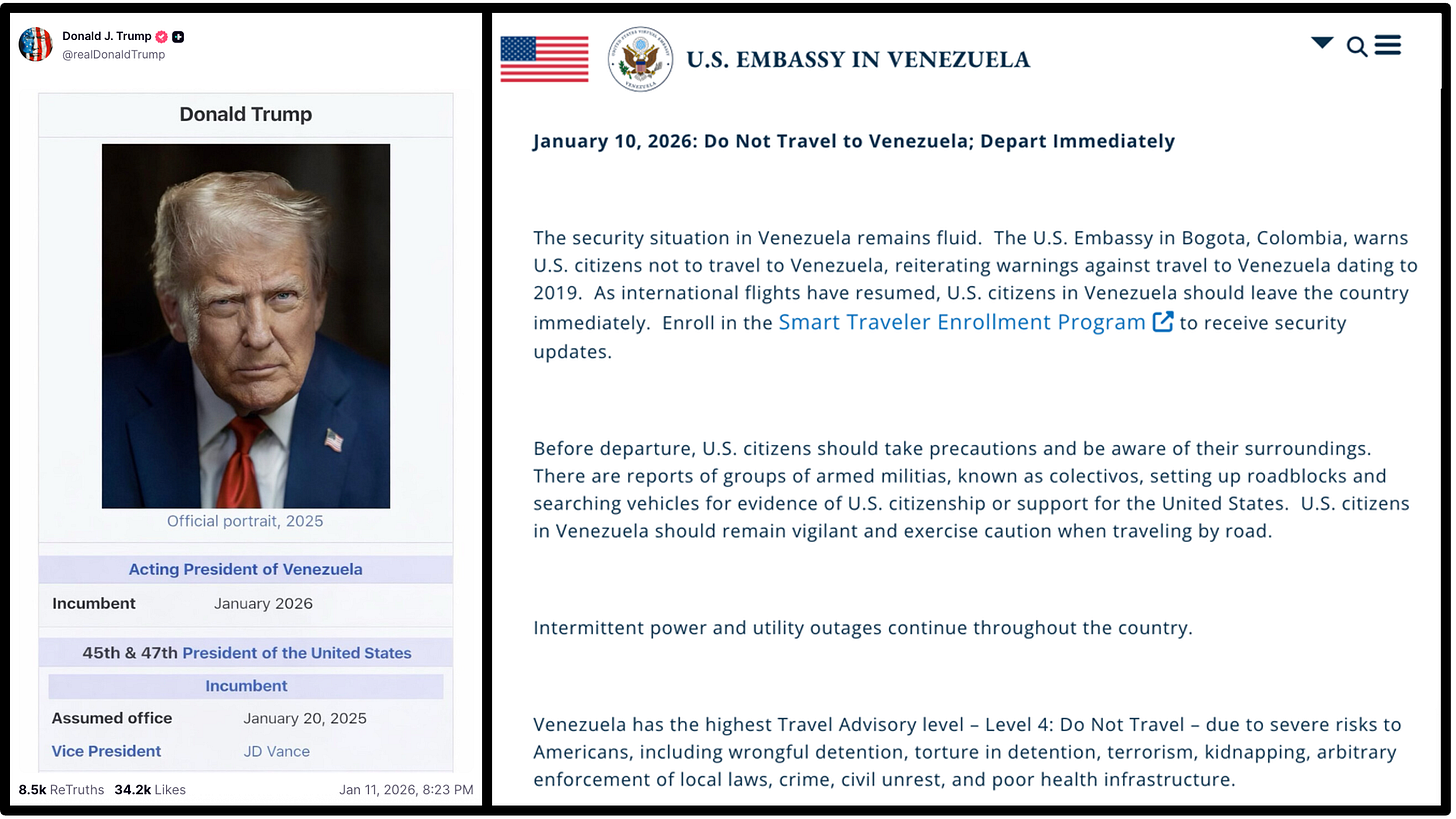 That travel guidance came one day before Trump posted a graphic on Truth Social identifying himself as “Acting President of Venezuela.” It is somewhat odd to see, in the span of a single weekend, messages that say Trump is running both the U.S. and Venezuela, but also that citizens of the former should “Depart Immediately” from the latter due to “risk of wrongful detention, torture in detention, terrorism, kidnapping, arbitrary enforcement of local laws, crime, civil unrest, and poor health infrastructure.” The U.S. government must be furious at Venezuela’s Acting President about all that! Oh wait…