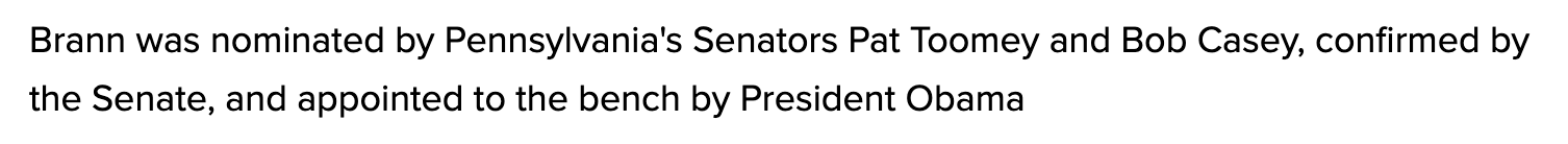 The Obama-nominated Judge Brann in Pennsylvania has a similar story. At the time, Pennsylvania’s Senate delegation was split between Democrat Bob Casey and Republican Pat Toomey. There were also two judicial vacancies. So the senators cut a deal: Casey would get to pick one judge, Toomey would get to name the other, and both senators would sign the blue slips for both nominees. Brann was Toomey’s pick. (Sen. Dianne Feinstein called him “probably the most Republican judicial nominee from the Obama White House” at his confirmation hearing.)