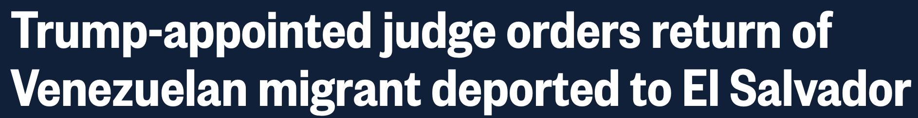 The first headline is about Stephanie Gallagher, a federal district judge in Maryland, who ordered the Trump administration in April to facilitate the return of a Venezuelan migrant (known in court filings as “Cristian”) deported by the U.S. to an El Salvador prison, despite a prior court settlement that barred his removal. (Cristian was ultimately sent to Venezuela as part of a broader prisoner swap. The administration has offered to bring him back to the U.S., but it is currently unclear whether he wants to do so.)