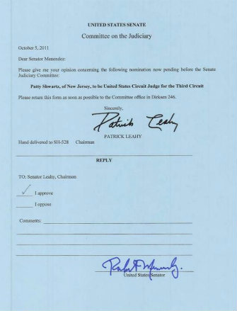 Over time, blue slips became the physical manifestation of senatorial courtesy, at least in the context of judicial nominees. As far back as 1917, when the president would nominate a district or appeals court judge, the chair of the Senate Judiciary Committee would send forms asking the opinions of the two senators from the state the judge would be sitting in. (So the two senators from Maryland for the district court in Maryland, for instance. For appeals courts, which cover multiple states, the slips would go to the senators representing whichever state the nominee was from.)
