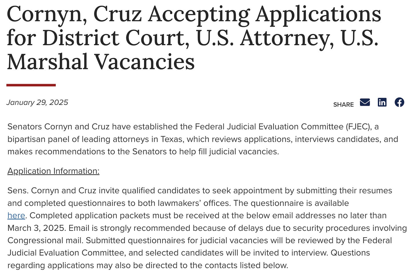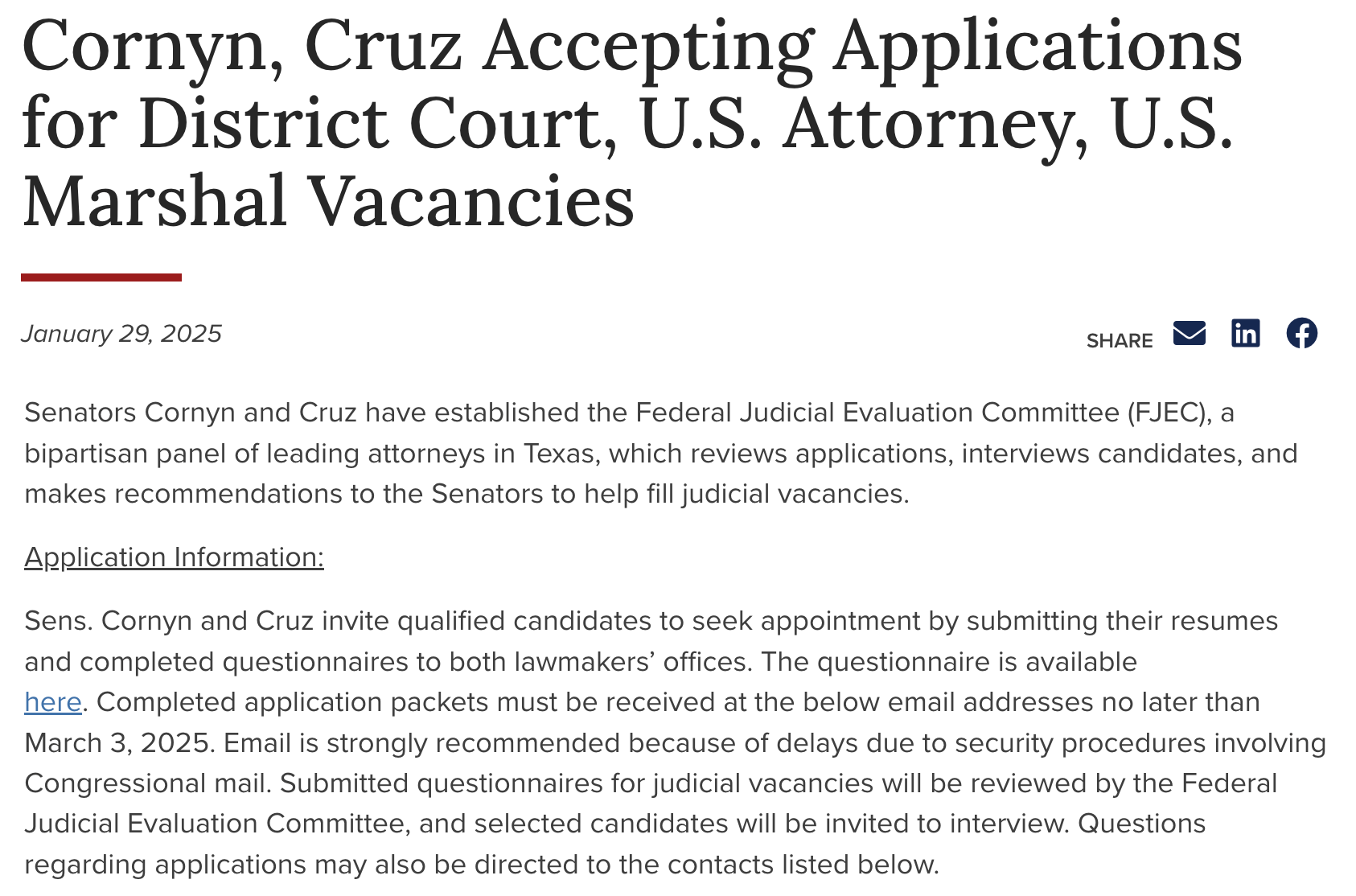 Did you know you can apply to be considered for a federal judgeship? Oftentimes, you can, through your Senate office. Many Senate delegations will solicit applicants for vacant judgeships, and then they have a screening committee set up that will select a recommendation. And, what do you know! The recommendation from the senators usually becomes the president’s nominee. And then everyone can rest easy knowing that the senators will quickly check off the blue slip for the nominee since, after all, the senators are the ones who chose them! Easy peasy!
